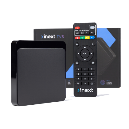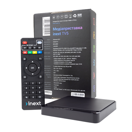 iNeXT TV5 - ТВ приставка на платформі Android 10, підтримує роздільну здатність 4K і кодеки H.264, H.265. Об'єм вбудованої пам'яті становить 8 ГБ, а оперативної пам'яті - 1 ГБ (DDR3).